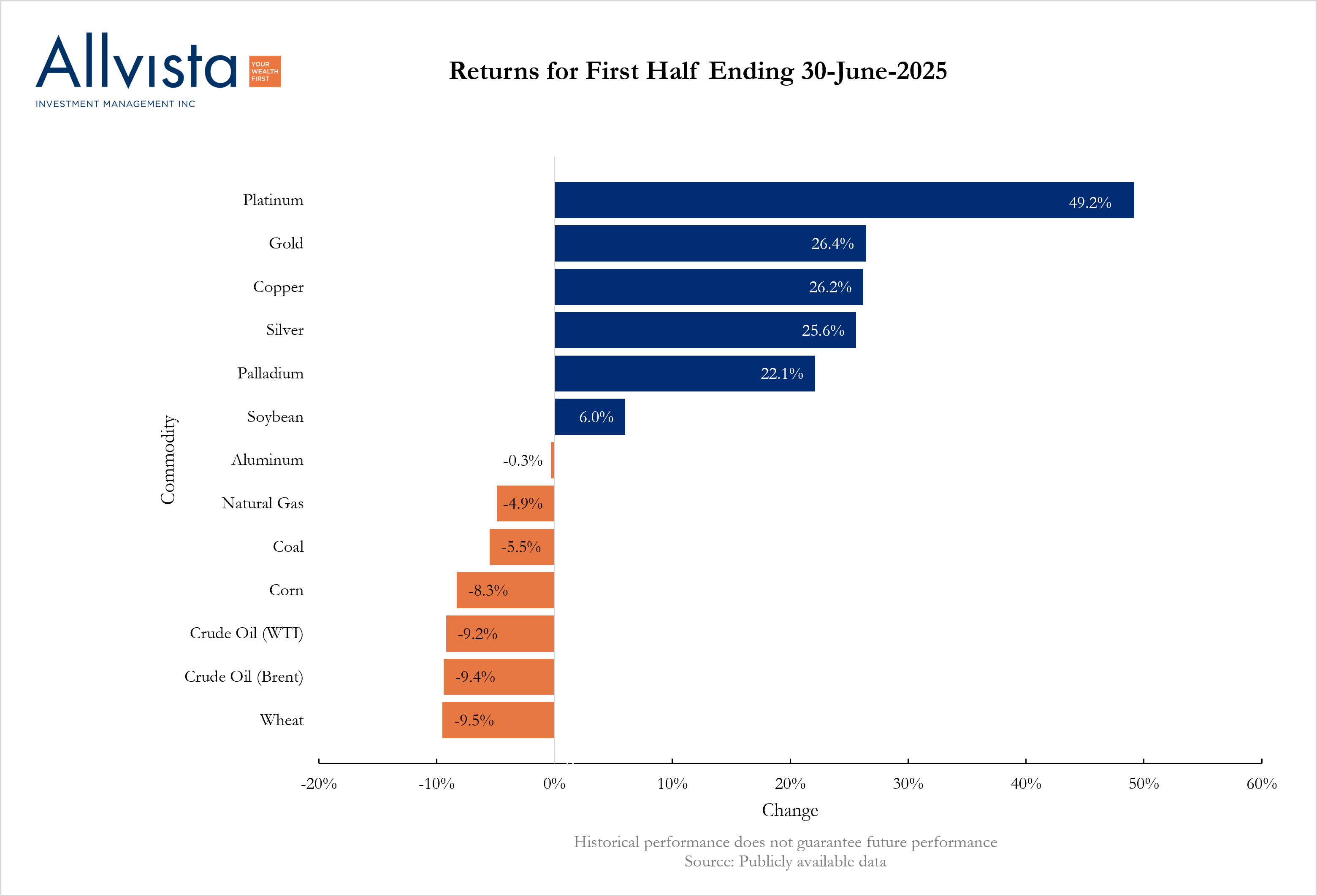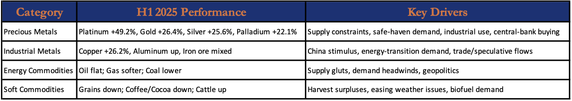 The first half of 2025 delivered a tale of two markets across the commodity complex, with precious metals and base metals surging while energy and agricultural commodities faced significant headwinds. Against a backdrop of escalating trade tensions, Middle Eastern conflicts, and shifting monetary policy expectations, commodity performance ranged from platinum’s spectacular 49.2% gain to wheat’s 9.5% decline.