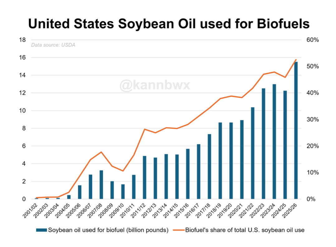 The scale of this demand shift was unprecedented. According to the USDA’s July supply-and-demand report, US biofuel makers are projected to consume more than half of all soybean oil produced domestically in 2025/26 marketing year – a record 15.5 billion pounds, representing an 11.5% increase from the previous month’s forecast and 26.5% higher than the current marketing year.